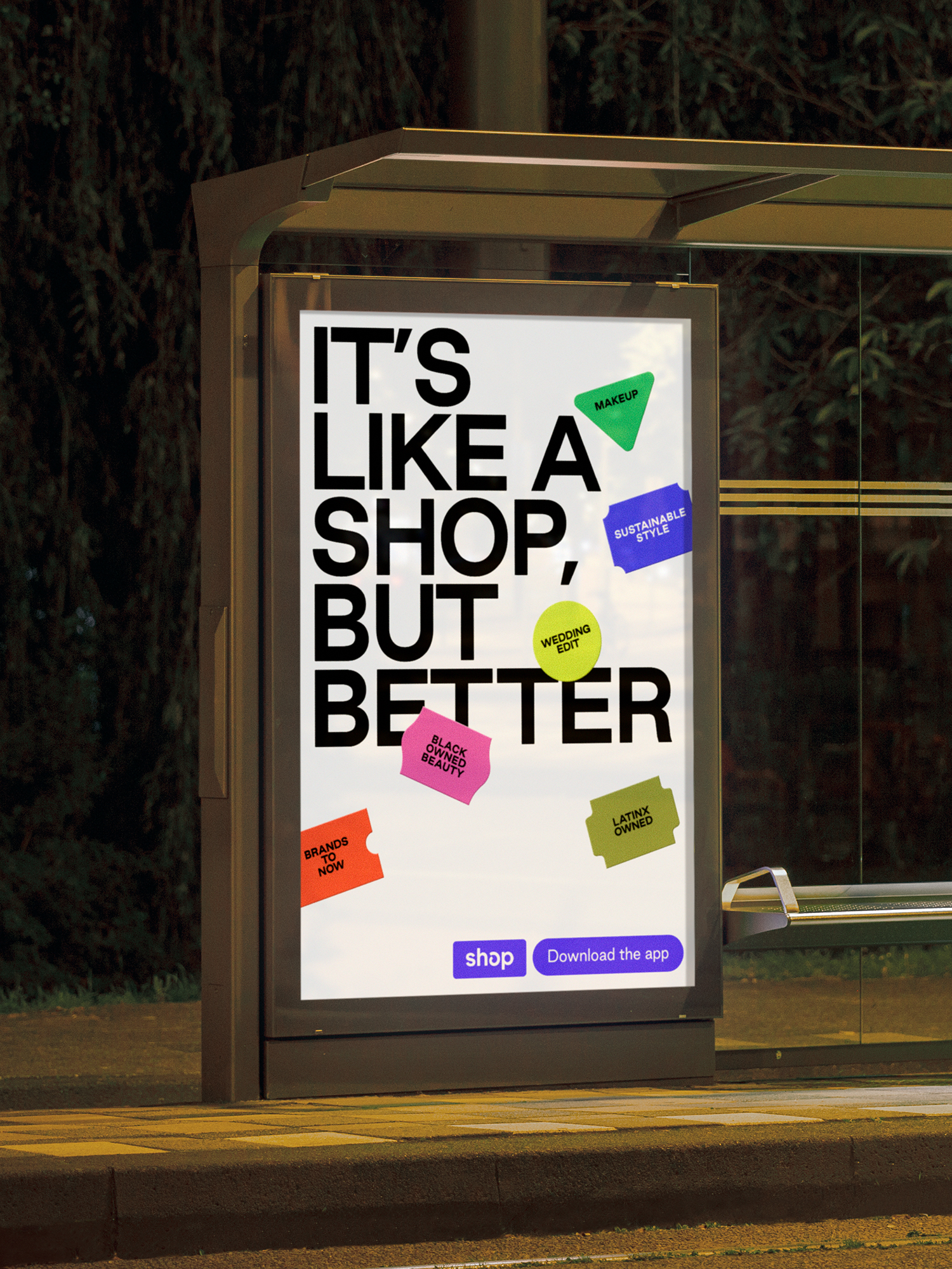 But despite the app’s popularity, Shop faced a perception challenge. People still thought of the brand as just “that purple button” or a package-tracker, not a delightful shopping destination. In 2021, the Shop team invited us to evolve their visual identity to reflect a shift in their brand and product: from function-first to community-driven, transactional to aspirational. Maintaining Shop’s core equities—their logo and Shop Purple—we systematized what was already working with a more expansive toolkit to build out their brand world.