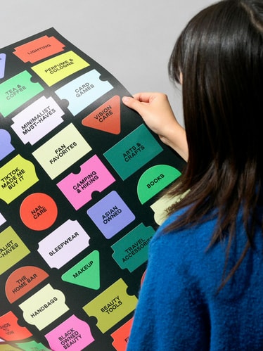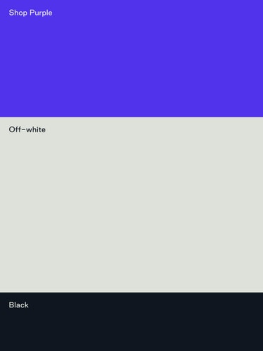 An expanded color palette allows the brand to speak to different products and merchants without an overreliance on Purple, supported by an off-white and warm black. Color shows up in the brand’s 2D sticker language, too. Inspired by old-school price tags, these diverse shapes can be superimposed on imagery to highlight secondary information without overshadowing the central message or product. Scaled up alone or clustered together, they’re equal parts function and play.