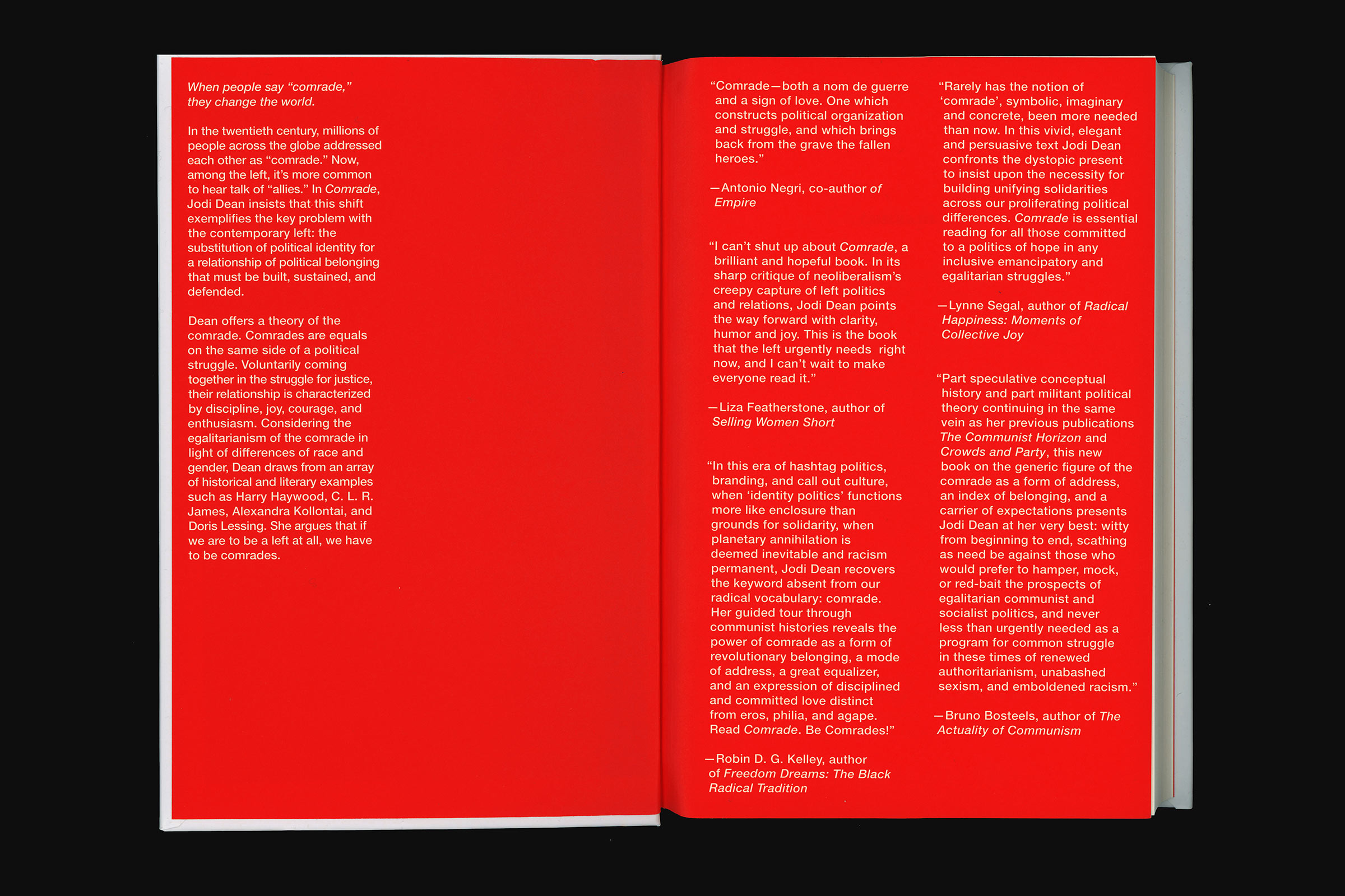 “Publicly declaring one’s stance” is key to the comrade, informing our assertive, brutalist approach to the cover which instantly commands attention. Dean’s comrade is inherently divisive, creating space between “us and them.” To further define these boundaries, we removed the author’s name from the cover, instead allowing the word “comrade” to occupy every printable inch available.