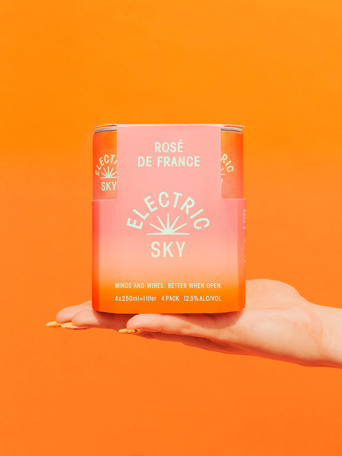 The freeflow of gradients reflect Electric Sky’s own non-binary values which exist outside of a “yes or no” and “right or wrong” structure. Tied together with a new sun symbol that rises or sets depending on your perspective, each sip of Electric Sky conjures a sunny California day and the wild landscape of colors as day turns to night and night back to day.