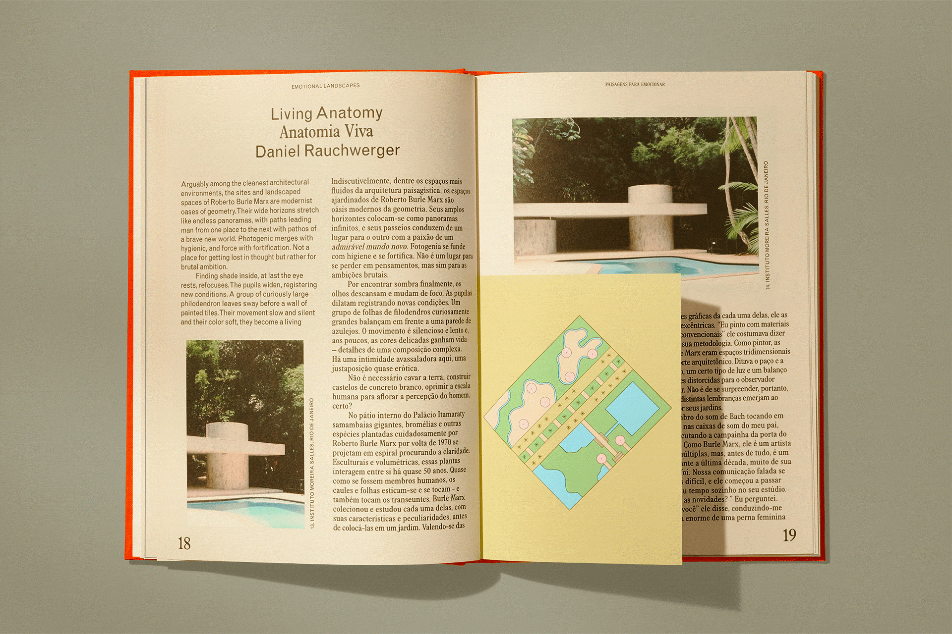 Reflecting Burle Marx’s timelessness and distinct Brazilian flair, Emotional Landscapes guides the reader through a bilingual experience structured by a two-column layout. The dual narrative is emphasized further by juxtaposing a serif and sans serif typeface for each language.