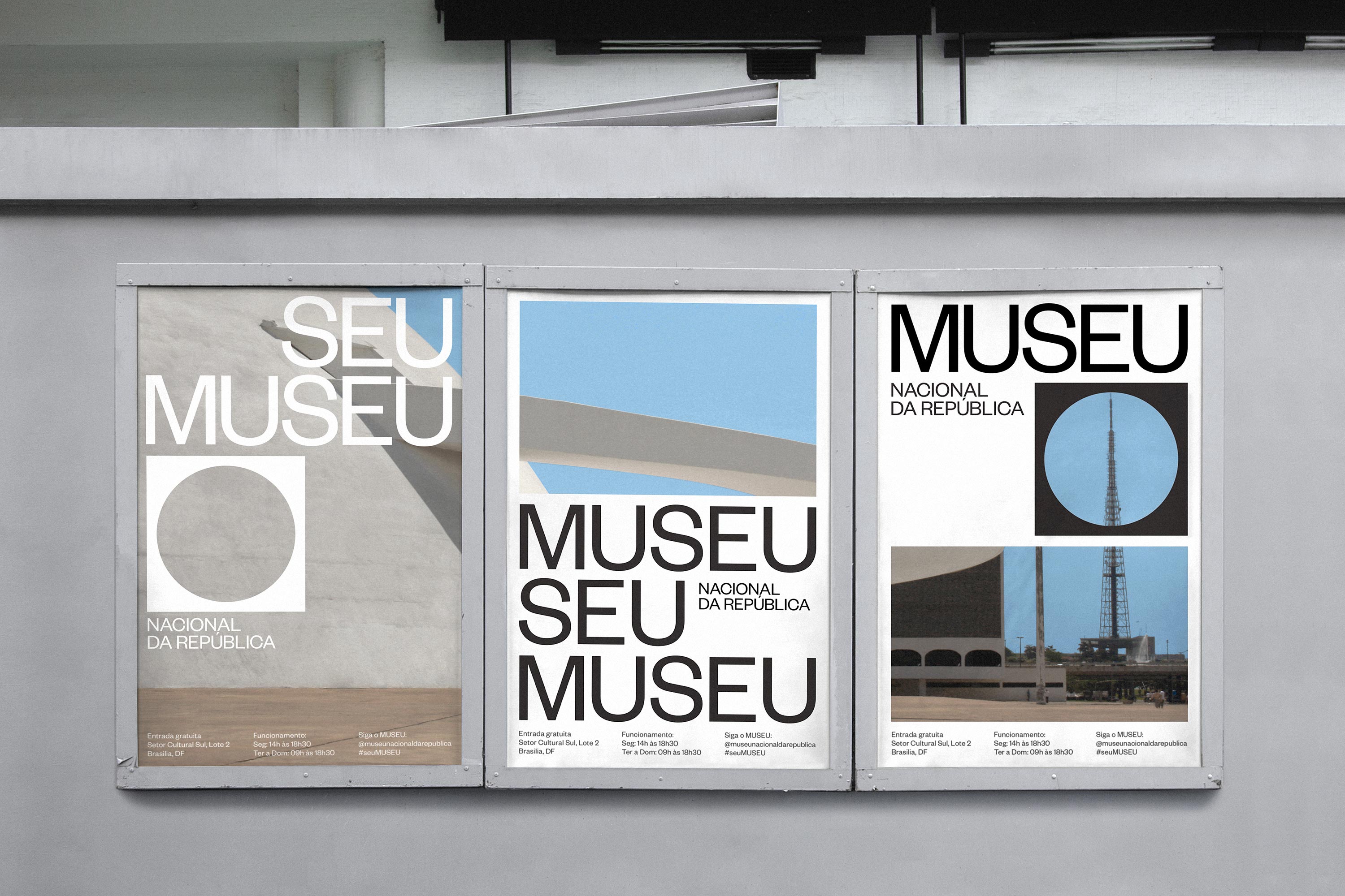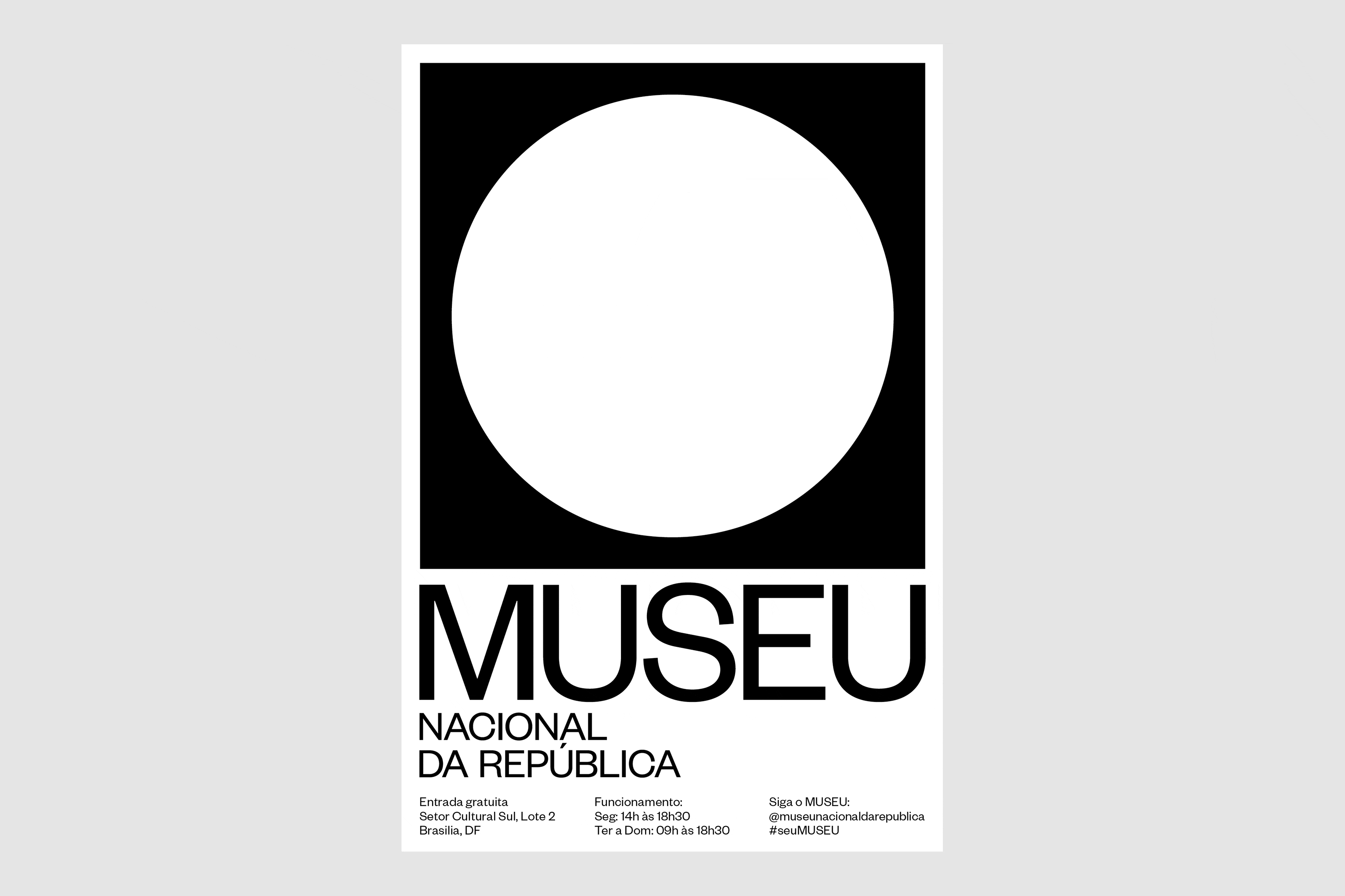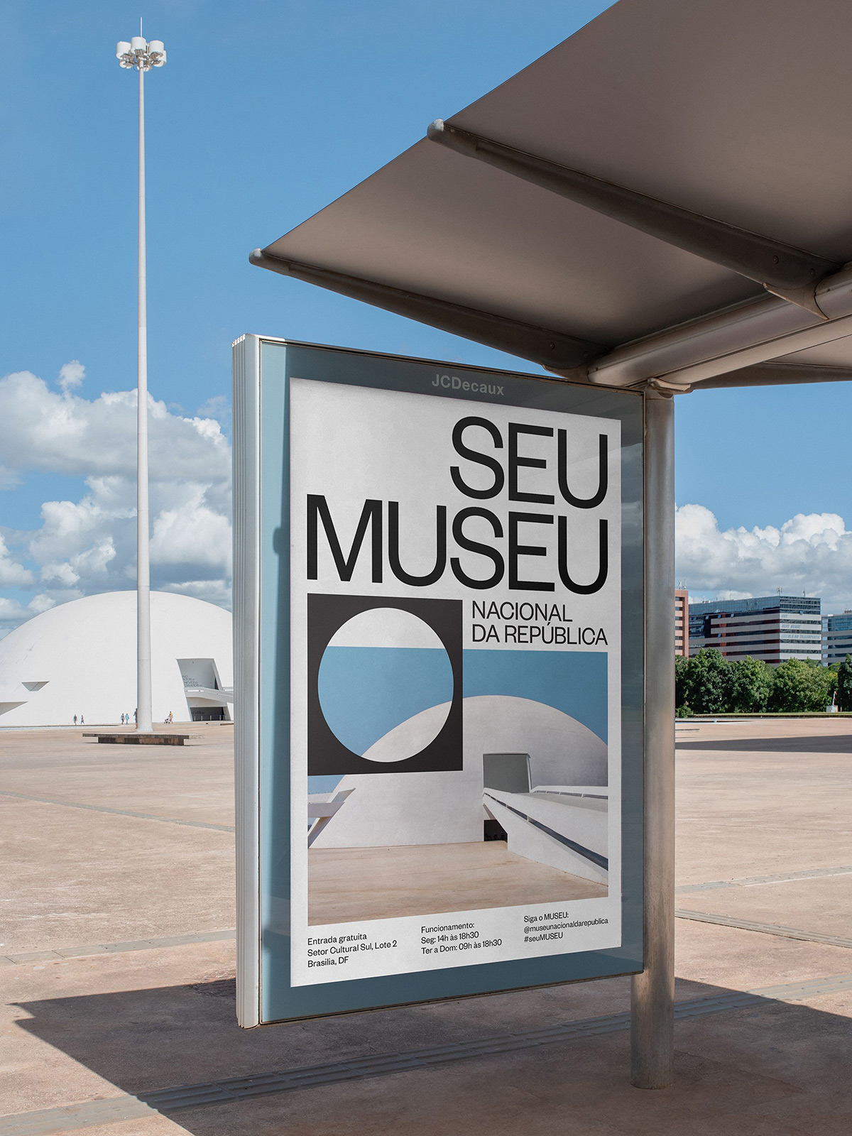 The circle and square join together to create a modern symbol for Museu Nacional. As a central feature of the identity, it represents the aerial view of Niemeyer’s dome while establishing the idea of “inside and outside”, contrasting the relationship between these two spaces. More than what it encloses, the surrounding area of the museum acts as a bustling social hub where citizens congregate, musicians perform, activists protest, others practice yoga and so on. Like a portal, the circle also functions as a graphic device that contains different imagery, be it photography, architecture, art or video, connecting and juxtaposing these two spaces in a constant state of dialogue and tension. A contemporary take on a traditionally modern typographic style, the use of Founders Grotesk recalls the visual language employed during Brasília’s early urban development while its circular letterforms allude to the museum’s infinitely curved walls.