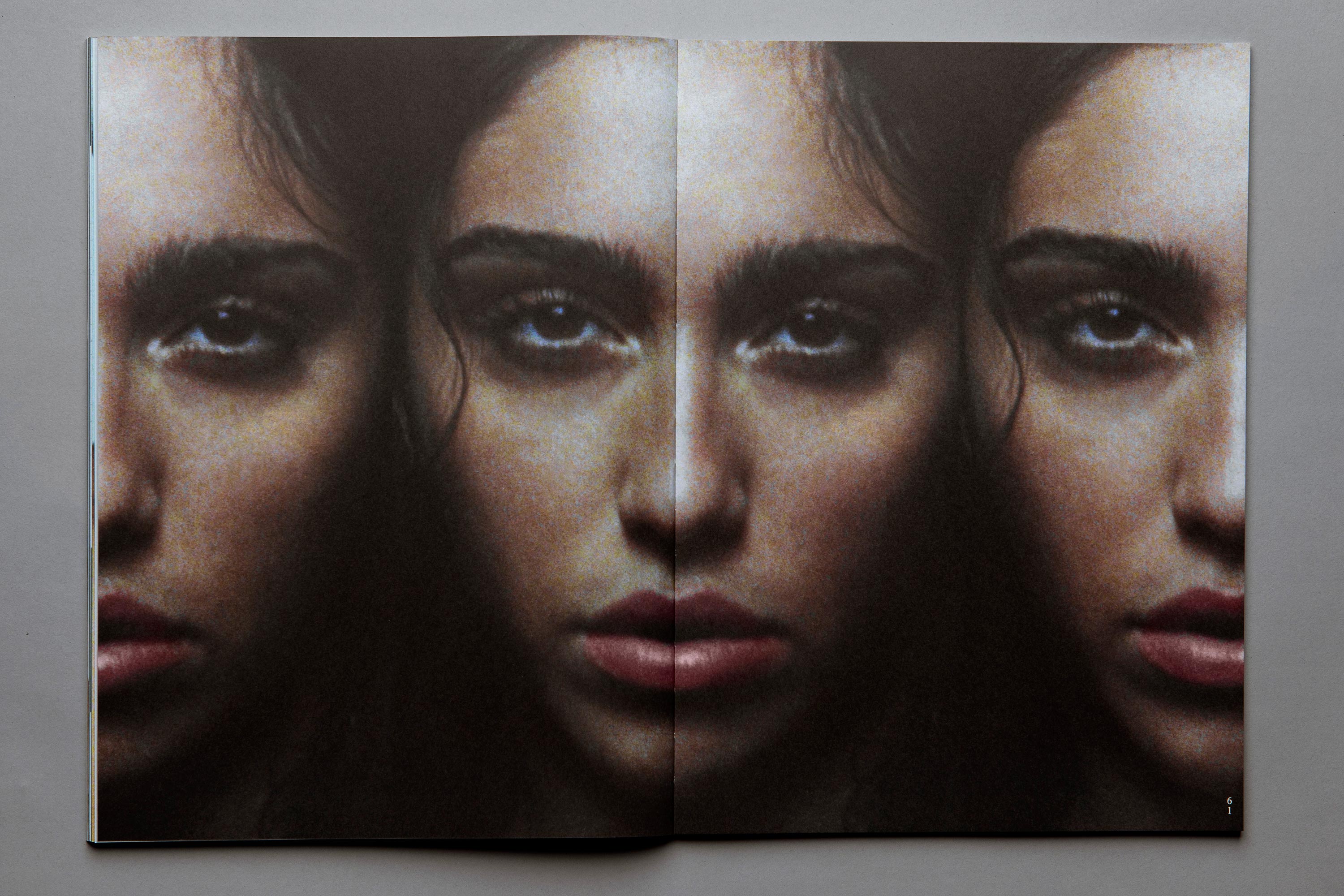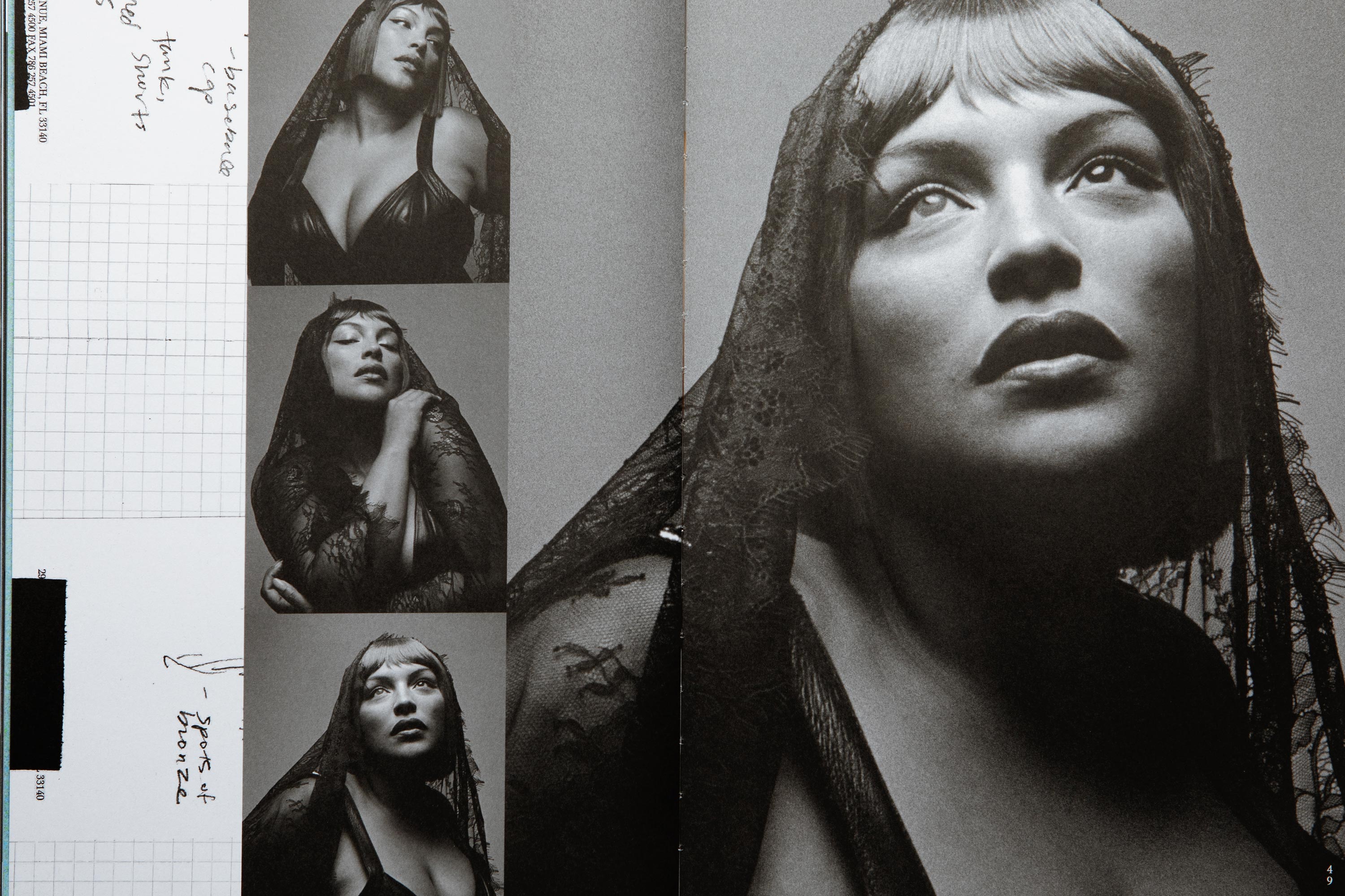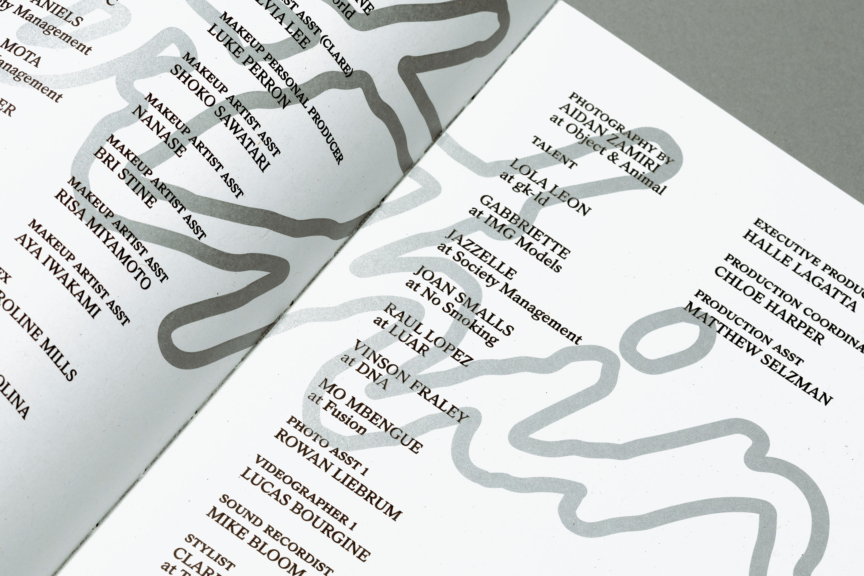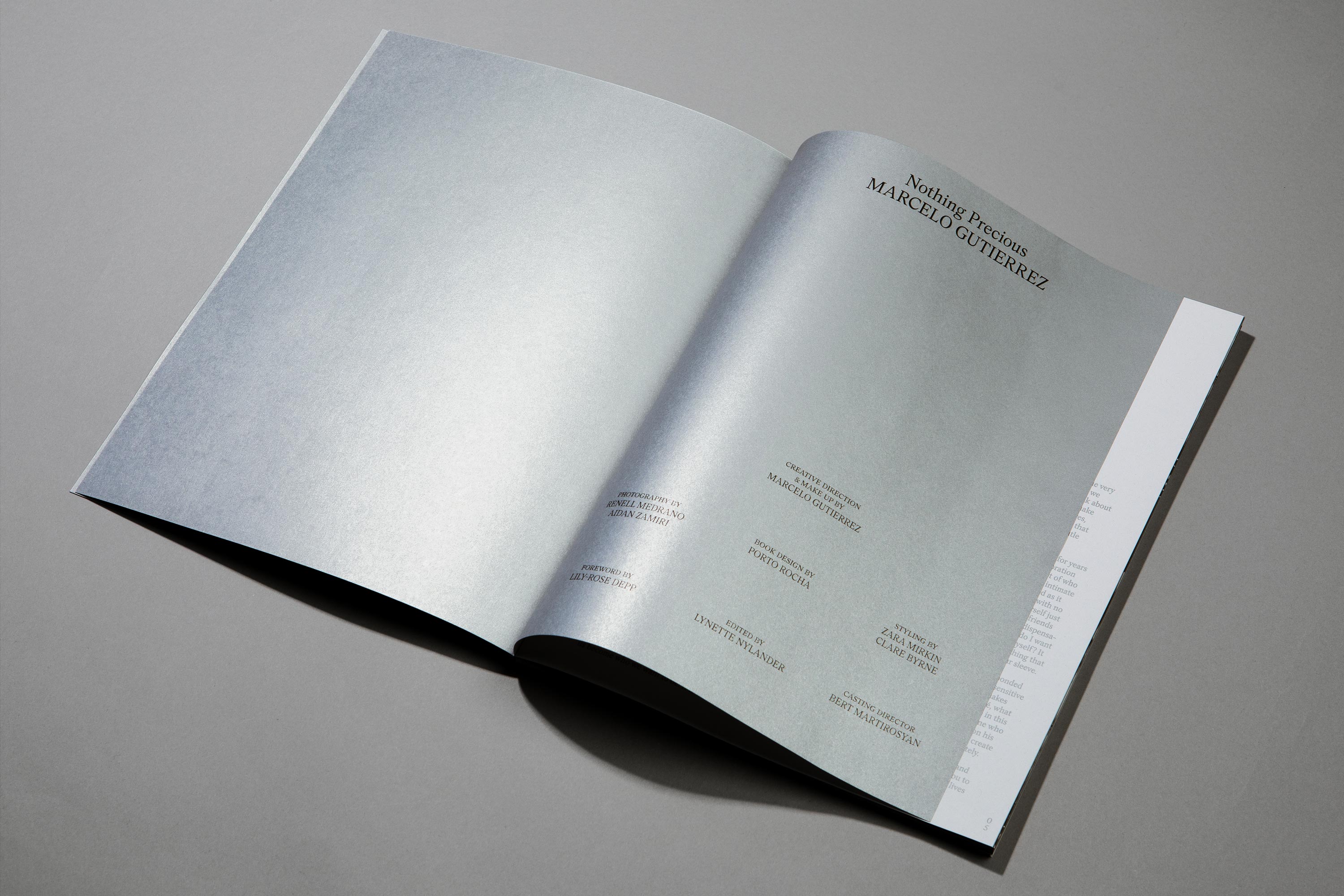 Our design speaks to the tensions at play in Marcelo’s work — his vision of beauty is subtle yet subversive, unfiltered yet polished, classic but undoubtedly of-the-moment. For the cover, we created a hand-lettered title and superimposed it on a macro crop of model Jazzelle’s face. The book’s materiality underscores this contrast: a glamorous silver metallic ink against “unprecious” uncoated paper with exposed binding.