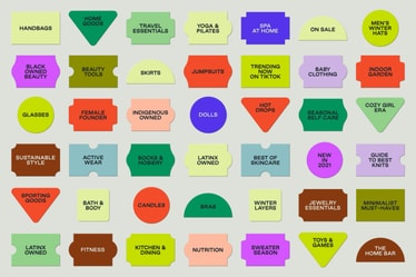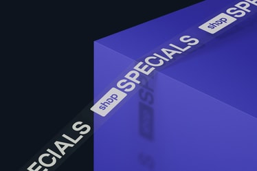 An expanded color palette allows the brand to speak to different products and merchants without an overreliance on Purple, supported by an off-white and warm black. Color shows up in the brand’s 2D sticker language, too. Inspired by old-school price tags, these diverse shapes can be superimposed on imagery to highlight secondary information without overshadowing the central message or product. Scaled up alone or clustered together, they’re equal parts function and play.